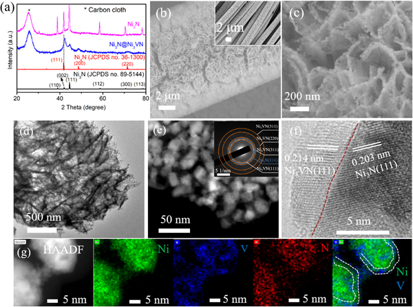 (b-g)Ni3N@Ni3VN的SEM和STEM表征:(b)SEM图像(插图:低倍率图像),(c)放大SEM图像,(d)低倍率TEM图像,(e)高倍率TEM图像(插图: SAED模式),(f)HRTEM图像,(g)STEM EDS元素分布图像。