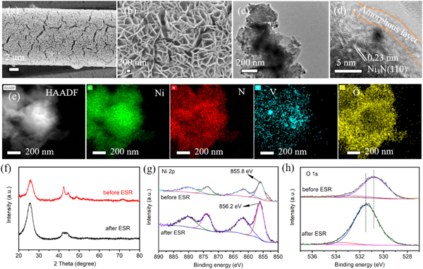 (a)低倍率和(b)高倍率时的SEM图像,(c)TEM图像,(d)HRTEM图像,(e) EDS元素分布。原位ESR前后(g)Ni 2p和(h)O 1 s的(f)XRD图谱,XPS光谱的比较。