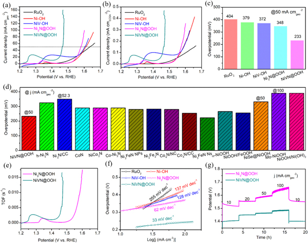 (a)iR校正的极化曲线:(a)归一化的电流密度 (b)ECSA,(c)在50 mA cmgeo-2的电流密度下的过电位,(d)TOF值,(e)从(a),(f)在10、20、50、100和10 mA cmgeo-2的连续电流密度下进行长期稳定性测试的LSV曲线得出的Tafel图,(g)本工作在NiVN@OOH中所得的η50与最近报道的最先进的金属氮化物和氧氢氧化物的比较。