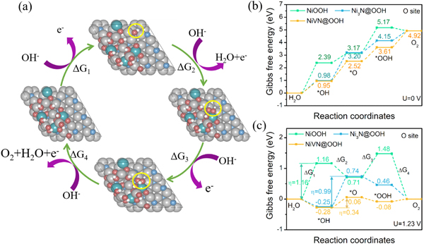 (a)吸附在模型O位点上的*OH、*O和*OOH中间体的结构(黄色圆圈为吸附位点;红色、灰色、白色、蓝色和青色的球代表O、Ni、H、N和V原子)。U = 0 V(b)和U = 1.23 V(c)时OER的自由能图。