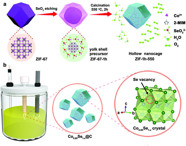 发展环境友好型和可持续的转化技术对可再生能源的储存和利用具有重要意义。例如,通过电化学水分解制氢被认为是可再生能源便捷储存和高质量利用的最有前途的方法之一,但它的实际应用很大程度上取决于成本和效率。水分解涉及两个半反应,即阳极的析氧反应(OER)和阴极的析氢反应,这决定了水分解的效率。但是,缓慢的OER动力学一直是电化学水分解制氢广泛应用的主要问题,这与复杂的质子耦合多电荷转移过程密切相关,从而导致引发反应的高过电位。在过去,贵金属RuO2基氧化物被广泛用于促进OER的电催化剂,然而,它存在成本高和稳定性不足的问题。目前,越来越多的人致力于开发具有更高活性和耐久性的经济高效的OER电催化剂。由于催化剂的活性与活性位点的数量和内在活性直接相关,提高这两个参数的策略已被广泛利用。考虑到贵金属的高价格,非贵金属氧化物、硫化物和硒化物作为替代电催化剂已经引起了广泛的关注。金属有机框架是一类具有超高孔隙率和巨大内表面积的晶体材料,其面积超过6000 m2 g-1,也可以作为一种极好的材料平台,形成具有清晰中空形态的过渡金属衍生物。近年来,由MOFs衍生的中空结构的过渡金属硒化物纳米笼因其大的暴露表面积、丰富的活性位点以及过渡金属硒化物固有的高导电性而被认为是一种很有前途的电催化剂。另一方面,空位工程被认为是调节金属氧化物、金属硫化物和金属硒化物OER活性的有效策略。研究表明,表面空位可以极大地影响电催化剂的电子结构,而具有适当空位的结构是实现理想的中间结合能的关键,这也是构建高效OER电催化剂的关键。如果能在过渡金属硒化物中引入适量的结构空位,就可以大幅提升催化活性。然而,迄今为止,大多数MOF衍生的过渡金属硒化物都是由MOFs前驱体和Se粉末在400-600℃下直接高温煅烧制得,而这样的高温过程一般都会得到表面空位相当少的高结晶产物。因此,设计出具有丰富空位的MOF衍生物是一个很大的挑战。此外,据报道,在OER反应过程中,过渡金属硒化物、硫化物和磷化物会转化为金属氧化物或氢氧化物,这些金属氧化物或金属氢氧化物的导电性通常比前驱体差得多。因此,耐久性也是这类电催化剂的一大问题。