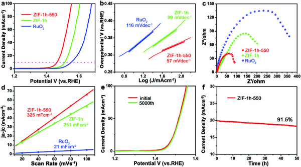 e)ZIF-1h-550在5000次循环前后的极化曲线。