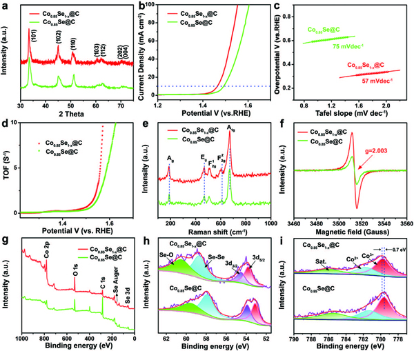 g-i分别是ZIF-1h-550和Co0.85Se@C样品的g)宽扫描和h,i)高分辨率Se 3d和Co 2p3/2 XPS光谱。