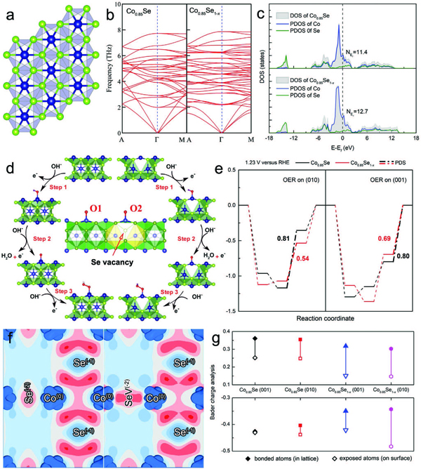 f–g)在裸露的表面(以(010)面为例)上的电荷密度差的分布,红色表示正区域,蓝色表示负区域,并且通过Bader电荷分析计算出Co和Se原子的价态 。
