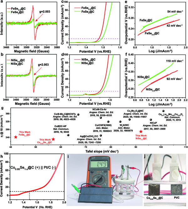 h–j)Co0.85Se0.51£0.49@C||Pt/C装置在1 m KOH(双电极结构)中进行整体水分解的极化曲线和由太阳能电池驱动的水分解装置的照片( ≈1.49V)。