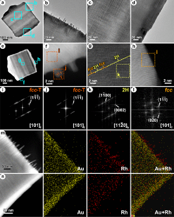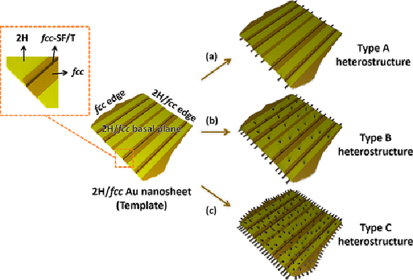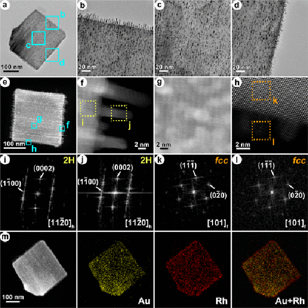 图1 以2H/fcc异相Au纳米片为模板构建三种1D/2D Rh-Au异质结构