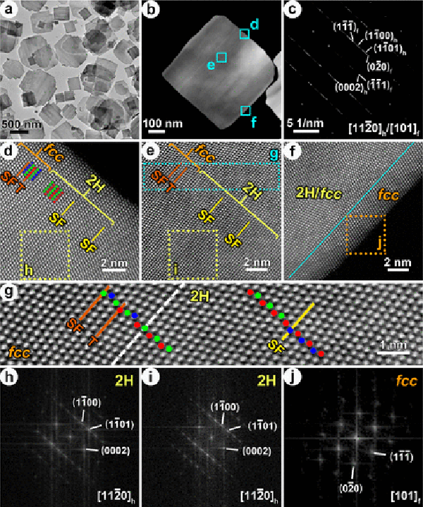 (f-h) 2H/fcc边缘(f)、2H/fcc基面(g)和fcc边缘(h)的原子分辨率HAADF-STEM图像。