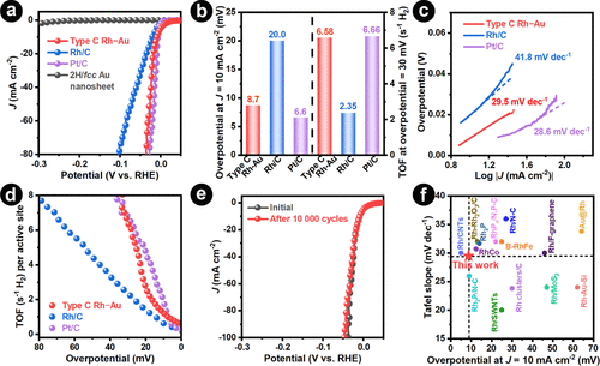 (b)C型Rh-Au异质结构、Rh/C和Pt/C在10 mA cm–2时的过电位(左轴)和30 mV时的TOF值(右轴)的比较。