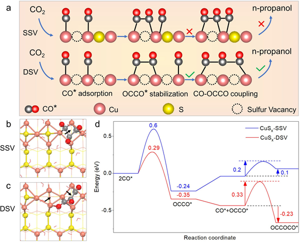 a)CuSx-DSV上形成正丙醇的机理示意图:在其中一个硫空位上可实现CO*的二聚形成OCCO*中间体,并可继续与邻近硫空位上吸附的CO*进行偶联,得到正丙醇的关键中间体OCCOCO*。。