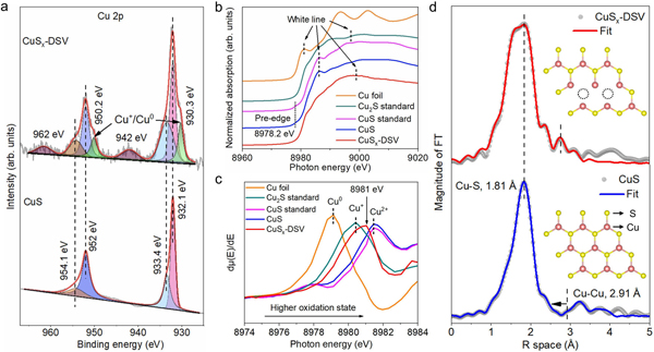 b,c)及CuS、CuSx-DSV、Cu箔、标准CuS和Cu2S样品的b)归一化Cu K边XANES和c)以一阶导数μ(E)/dE。
