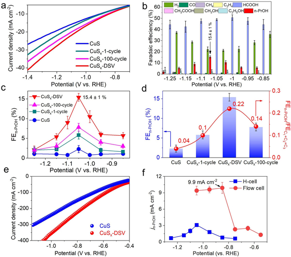 f)在H-cell(蓝色曲线)和流动池(红色曲线)体系下,CuSx-DSV作为催化剂获得正丙醇的部分电流密度与电位的关系。a-d)和e-f)中的数据分别在H-cell和流动池中测试获得。 b–d)和f)中的误差线棒对应于三个测量值的平均值±标准偏差。