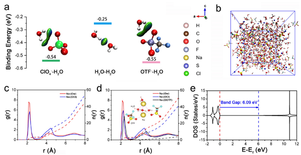 (c,d)cMD分别模拟了17 m NaClO4和19 m NaClO4-NaOTF中的成对分布函数以及Na和O原子的配位数;(d)的内嵌图为19 m NaClO4-NaOTF中Na+的溶剂化结构)。