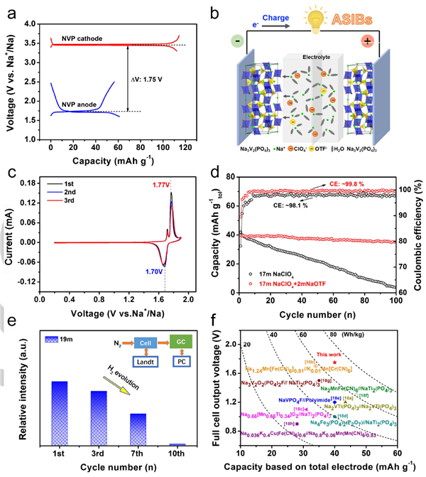由于资源丰富、绿色环保、生产成本低等优势,水系钠离子电池(ASIBs)在大规模储能领域极具发展优势。然而,水的电化学稳定窗口仅为1.23 V,因此大部分电极材料无法应用,这导致水系钠离子电池的工作电压和能量密度较低。近年来,随着高浓度水系电解液的成功开发,电解液的电化学稳定窗口被显著拓宽,但高浓度电解液也随之带来了粘度高、离子导电率低等问题。另外,高浓度电解液中通常采用的氟化有机盐导致电解液的成本高昂,难以产业化应用。为解决上述问题,进一步开发低成本水系电解液体系并基于此构建高比能水系钠离子电池具有重要研究意义。