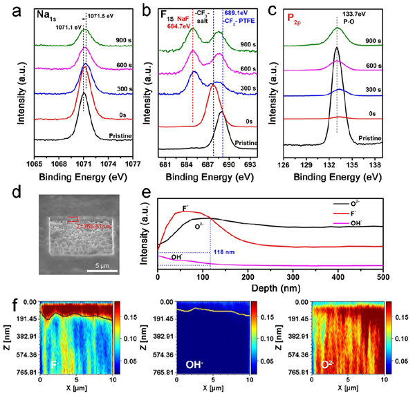 (e,f)F–,OH–,O2-的强度随溅射深度的变化曲线图以及纵向分布图谱。