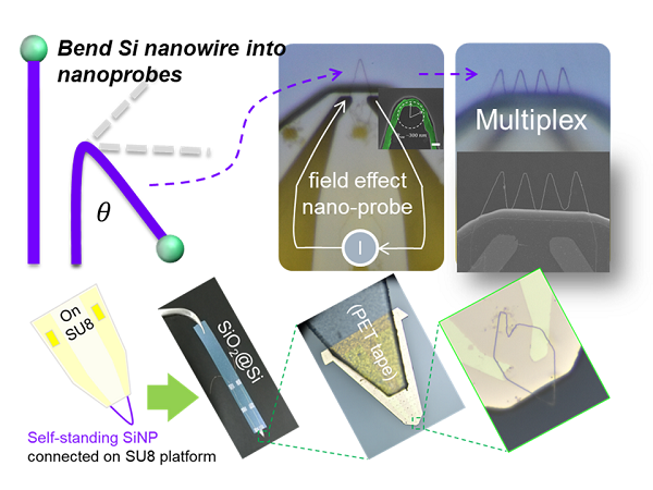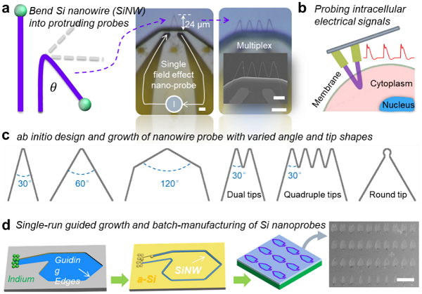 高灵敏度空间/时间分辨生物细胞电信号探测(high spatiotemporal resolution intracellular electric signal detection)是跟踪细胞生理动态、探索神经元信息交互逻辑和开发新型精准给药及基因治疗技术的基础共性需求。而一维半导体纳米线是实现超高灵敏度场效应探测的最理想沟道单元,近年来在生物和化学气氛探测领域受到了广泛的研究关注和应用探索。近期,哈弗大学Lieber教授等研究团队在Nature、Science等顶级期刊报道相继报道:如能将超细晶硅纳米线弯折成为突出的悬空回路探针,可以很方便地对单个细胞进行高灵敏度无损伤探测。相比于传统基于液体交换和离子导电的膜片钳技术,这种“自带电回路”的硅纳米线探针(Si nanowire probes, SiNPs)可以无损伤地插入活细胞内部,对单个或多个接触微区局部动态电信号进行高倍数场效应放大、实时探测和稳定跟踪。然而,目前研究中所用的纳米探针只能通过随机VLS生长或液体冲刷定形方式获得,无法可靠批量制备,更难以根据应用需求对探针形貌、夹角及多通道设计进行有效调控,因此难以实现大规模器件集成应用。