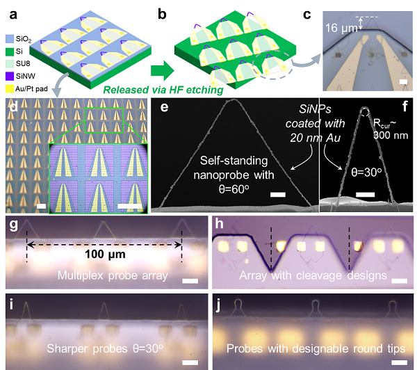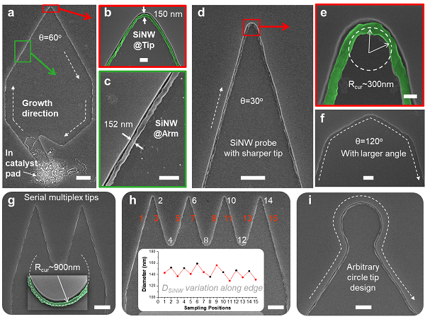 图2. 可编程引导生长定制的晶硅纳米线探针。探针尖端角度θ=60°(a)、θ=30°(d)、θ=120°(d)、多通道(g-h)以及圆形(i)探针。
