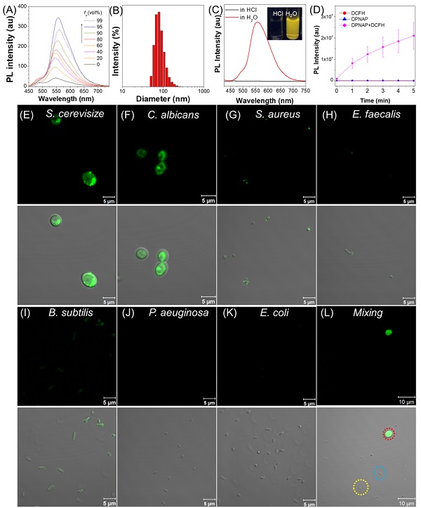(A)DPNAP在不同水含量的THF /水混合溶液中的荧光光谱 (B)水中DPANP的粒径分布 (C)DPNAP在中性和酸性水溶液中的荧光光谱 (D)活性氧探针DCFH在加入DPNAP后暗处及光照条件下的荧光强度 (E-K)酿酒酵母菌,白色念珠菌,金黄色葡萄球菌,粪肠球菌,枯草芽孢杆菌,铜绿假单胞菌,大肠杆菌(L)及混合微生物样品与与DPNAP作用后的CLSM成像结果