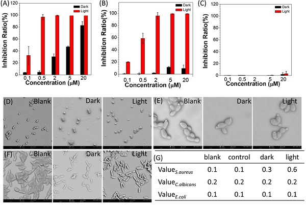 (A-C)不同浓度DPNAP在黑暗和白光条件下对金黄色葡萄球菌,白色念珠菌和大肠杆菌的抑菌率 (D-F)金黄色葡萄球菌,白色念珠菌和大肠杆菌在与DPNAP作用后暗处及光照条件下的(SEM)图像 (G)不同处理方式的微生物滤液核酸浓度