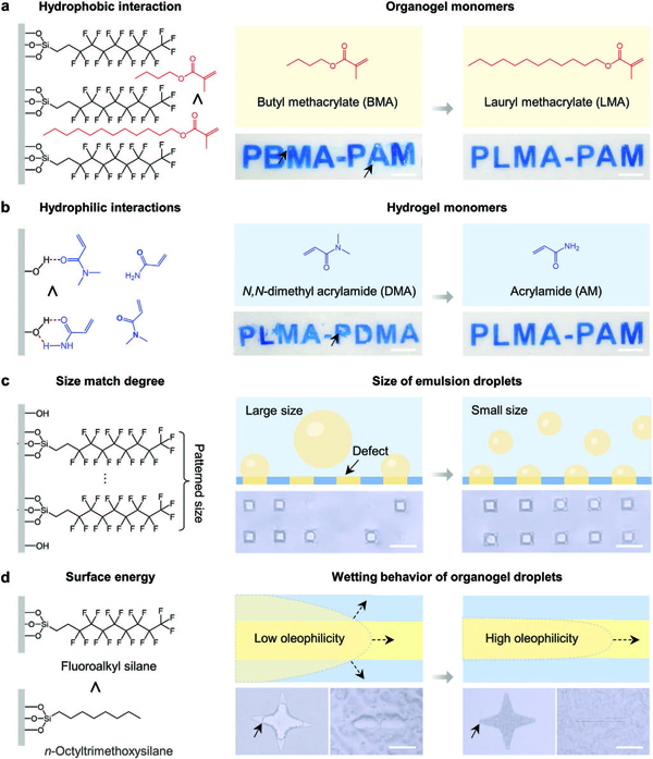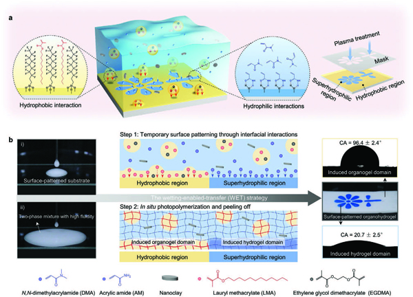a)在乳液体系中,油相的油凝胶单体更倾向于通过疏水作用被吸附在基底的疏水区域,而水相的水凝胶单体更倾向于通过亲水作用被吸附在基底的超亲水区域(左)。通过掩膜版辅助法(右)可以获得具有局部润湿性差异的基底。