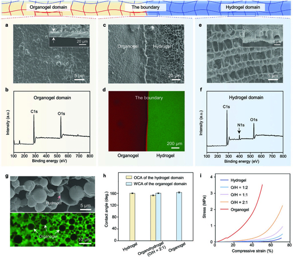 g)SEM图像(上图)和CLSM图像(下图)确认了表面图案化油水凝胶的内部结构组成。白色箭头表示油凝胶成分,粉色箭头表示水凝胶网络。