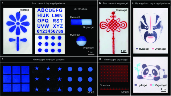 e)具有多区水凝胶和油凝胶表面图案的油水凝胶的两个例子。传统京剧脸谱(上)、著名的中国国宝熊猫(下)。值得注意的是,为了更好地展现图案,我们将部分图案区域染成了不同的颜色。