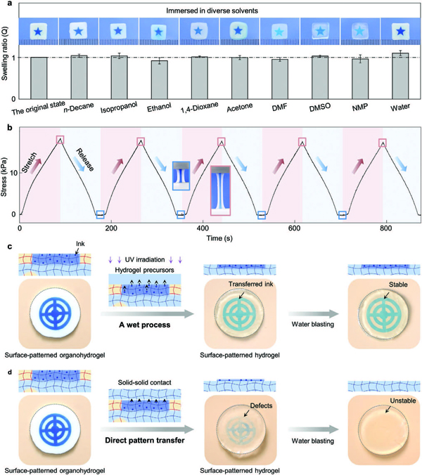 a)表面图案化油水凝胶在不同溶剂中的溶胀行为。