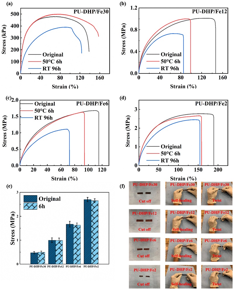 a-d)PU-DHP/Fe30、PU-DHP/Fe12、PU-DHP/Fe6和PU-DHP/Fe2在50℃和室温下初始曲线和修复曲线的应力-应变曲线;