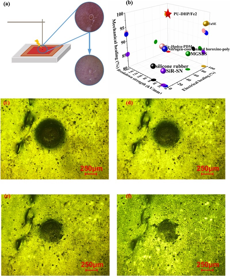 b)比较过去十年中电击穿自修复材料的电击穿强度、机械修复效率和电击穿修复效率。