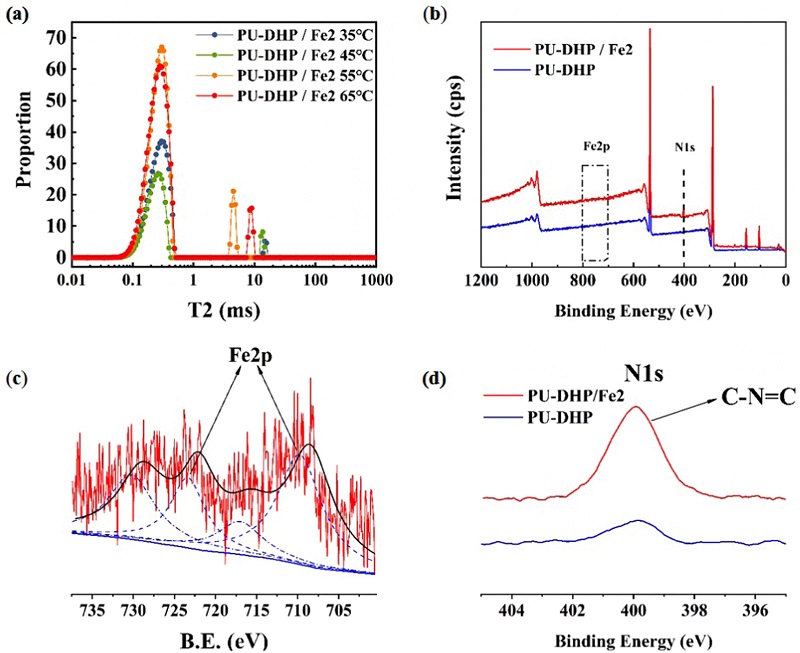 a)在不同温度下,PU-DHP/Fe2的低场NMR光谱;