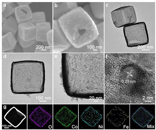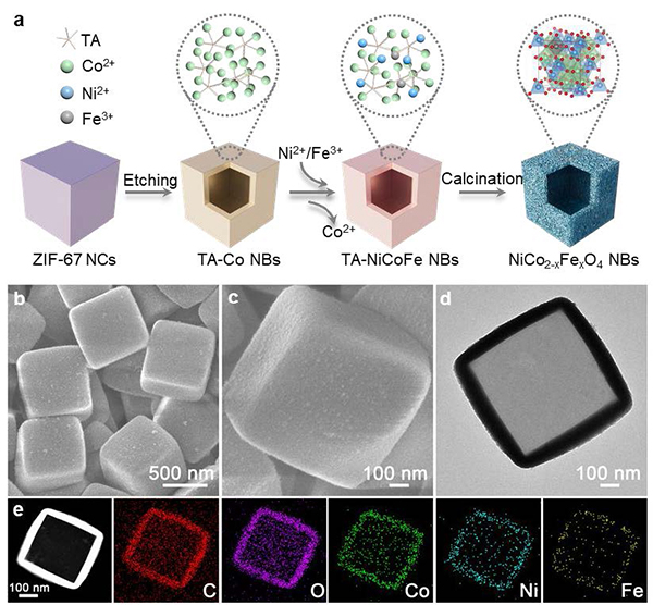 (a)三金属尖晶石氧化物纳米盒(NiCo2-xFexO4 NBs)的合成工艺示意图;