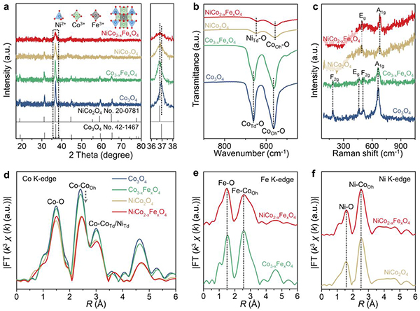 (a-d)Co3O4、Co3-xFexO4、NiCo2O4和NiCo2-xFexO4 NBs的XRD图谱,FTIR图谱,Raman光谱和FT Co K-edge EXAFS光谱;