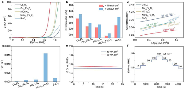 (a-d)Co3O4、Co3-xFexO4、NiCo2O4和NiCo2-xFexO4 NBs的LSV曲线,在特定电流密度下的过电位,Tafel曲线以及在过电位300 mV处的TOF值,同时与商业化RuO2对比;