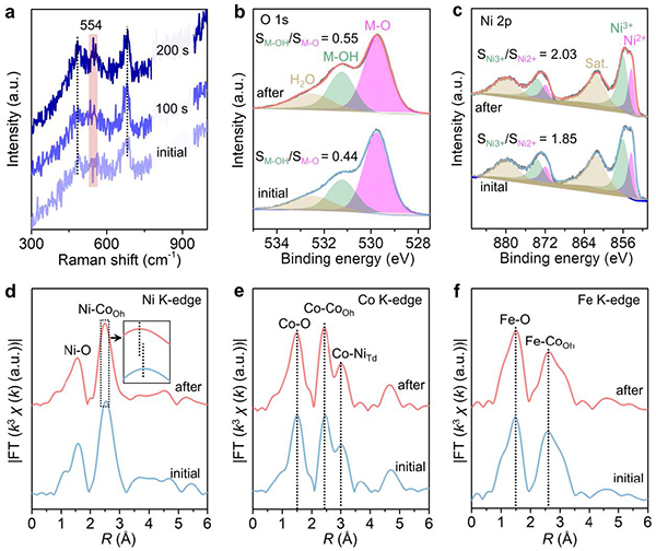图五、NiCo2-xFexO4 NBs在OER过程中表面变化的原位及半原位表征