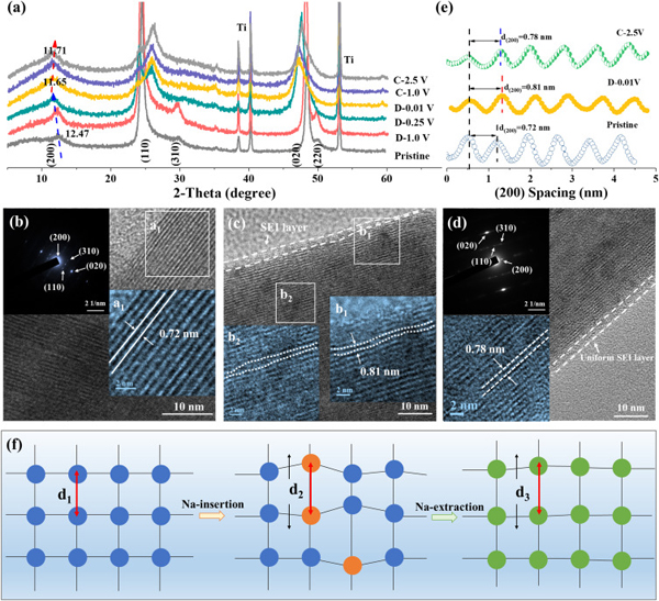 (a)SIBs中,不同充放电状态下Sn(Ⅱ)/Sn(Ⅳ)@HTO的XRD图谱。