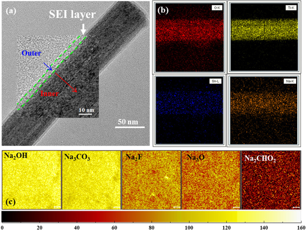 (a,b)Sn(Ⅱ)/Sn(Ⅳ)@HTO纳米线在SIBs中循环100次后的(a)TEM图像和(b)元素分布图。