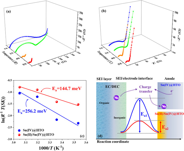 (a)Sn(Ⅳ)@HTO和(b) Sn(Ⅱ)/Sn(Ⅳ)@HTO在SIBs中放电-充电循环10次后的温度依赖性Nyquist图。