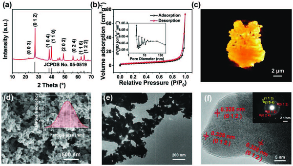 c–f)3DPBi的3D重建成像、SEM、TEM和HRTEM图像。(d,f)中的插图分别是3DPBi的大小统计图和SAED图。