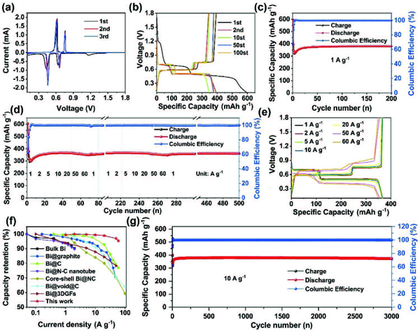 d,e)3DPBi电极在1~60 A g-1的不同电流密度下的倍率性能及相应的恒电流充放电曲线。