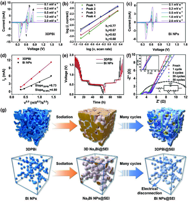 g)3DPBi和Bi NPs负极反应过程示意图。