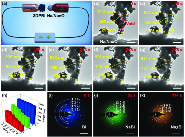 b–g)按时间顺序的TEM图像,显示了3DPBi中的嵌钠过程(比例尺: 500 nm)。