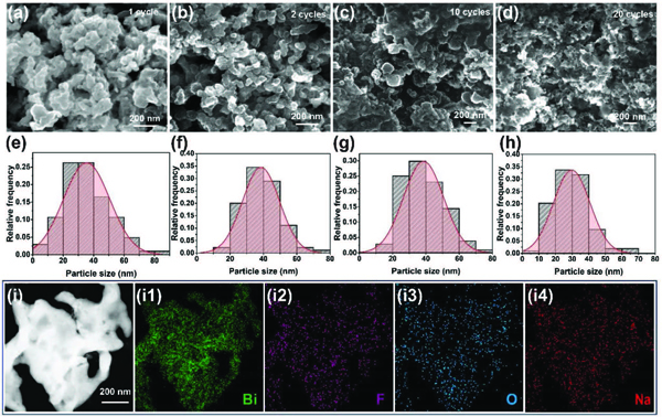 a–d)不同循环圈数后的SEM图像和e–h)尺寸分布的统计图。 i)3DPBi负极循环后的STEM图像和i1-i4)元素分布图。