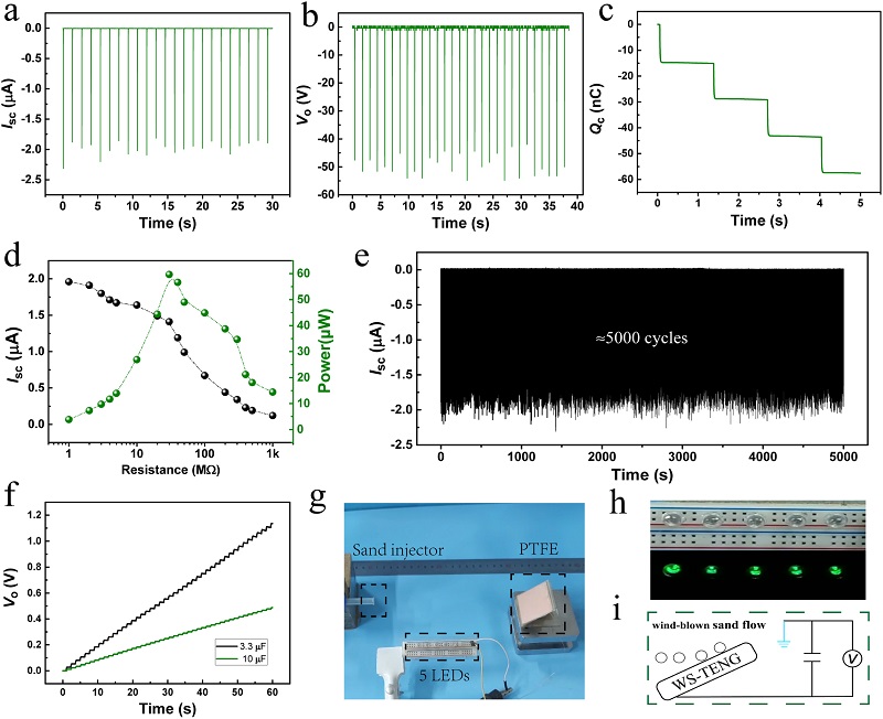 (d-f)在不同的进沙率(2、5、12、20和35 g/min)下,WS-TENG的Isc、Vo和Qc;