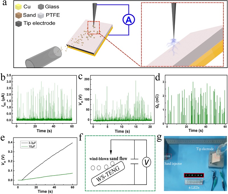 近日,中科院兰州化学物理研究所王道爱研究员、中国海洋大学刘盈副教授和上海交通大学张执南副教授等人基于气-固两相流(风沙流)与聚四氟乙烯(PTFE)薄膜之间的摩擦起电特性设计了一种新型风沙流驱动TENG(WS-TENG)。这种WS-TENG结构十分简单,采用气流挟沙法来模拟风沙流,以商品化PTFE薄膜作为摩擦层,相同尺寸的铜胶带粘贴在薄膜背面作为背部电极从而组成风沙流驱动的TENG。同时,作者制备了带有尖端电极的直流电WS-TENG(DCWS-TENG),以空气击穿放电的方法收集连续的风沙流的能量,无需额外的整流器设备直接为电容器充电以及驱动LED照明组件。此外,WS-TENG可用作自供电的主动输沙速率传感器,以在严酷的沙尘暴天气条件下执行简单的沙浓度监测。该工作为在荒漠化地区收集和利用风沙能提供了一种简单而可实现的方法,并且开发的传感器样机为低成本的自供电风沙浓度传感器提供了一个新的选择。研究成果以题为“Gas-Solid Two-Phase Flow-driven Triboelectric Nanogenerator for Wind-sand Energy Harvesting and Self-powered Monitoring Sensor”发布在国际著名期刊Nano Energy上。