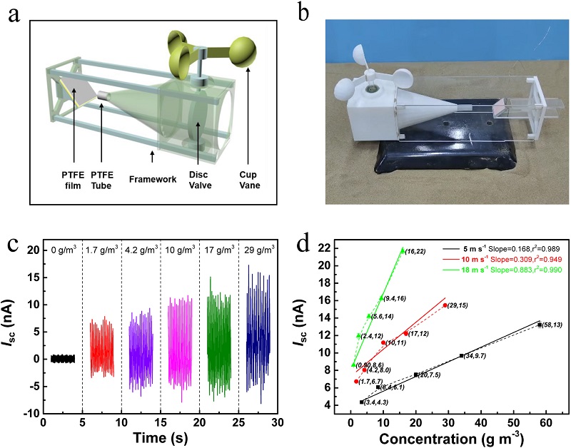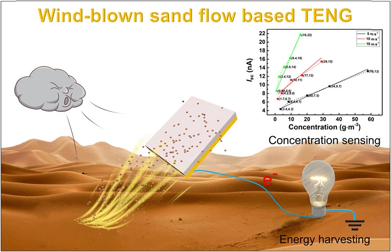 荒漠化地区光照条件好、土地开阔,具备太阳能光伏发电及风力发电的有利条件,然而,荒漠化地区强风导致地表沙尘活动频繁,如沙尘暴等易导致能源收集设备损坏从而影响发电输出,而这些风沙流能量通常被认为是有害能量被忽视。同时,实时监测风沙运动对沙漠化的跟踪和防治至关重要,但用于监测风沙流的传统传感器大多成本较高,且需要可持续电源保障其在恶劣沙尘环境中有效运行,迫切需要一个能自供电的风沙输沙率监测传感器。摩擦电纳米发电机(TENG)是一种基于摩擦起电与静电感应耦合的能量收集器件,近年来在收集机械能、声能、海洋能等领域引起了广泛关注。鉴于风沙流也是一种气-固两相流,理论上可以通过设计TENG来实现对荒漠化地区风沙能的收集和利用,但是,如何设计一种有效的TENG收集风沙能量还面临挑战。