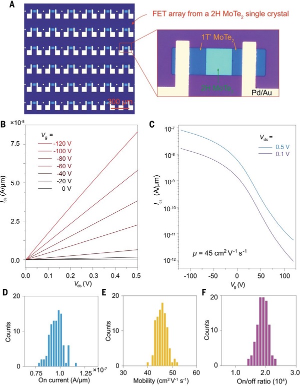 图4 基于单晶2H二碲化钼薄膜制造的FET器件的电学表征