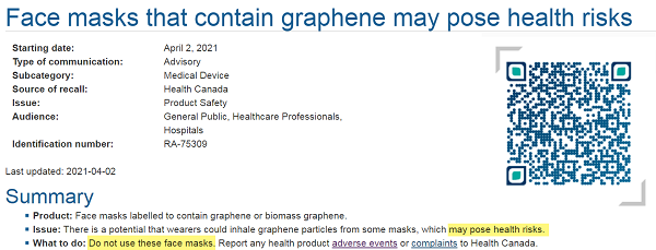 - 加拿大卫生部对现有研究的初步评估确认(identified),吸入的石墨烯颗粒有可能(potential)对动物造成早期肺毒性。然而,人体从口罩吸入石墨烯颗粒的可能性和相关的健康风险还不清楚(not clear),并且可能(may)基于口罩设计的不同而变化。对任何年龄段的人造成的健康风险都不清楚。各种变量(如暴露量和持续时间以及所用石墨烯材料的类型和特性)都会影响吸入颗粒的可能性(potential)和相关的健康风险。加拿大卫生部已要求口罩生产商提供数据,从而评估含有石墨烯口罩的潜在健康风险。
