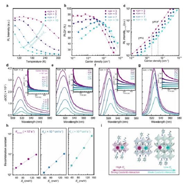 图4.Eb不同的准二维钙钛矿薄膜的复合动力学行为