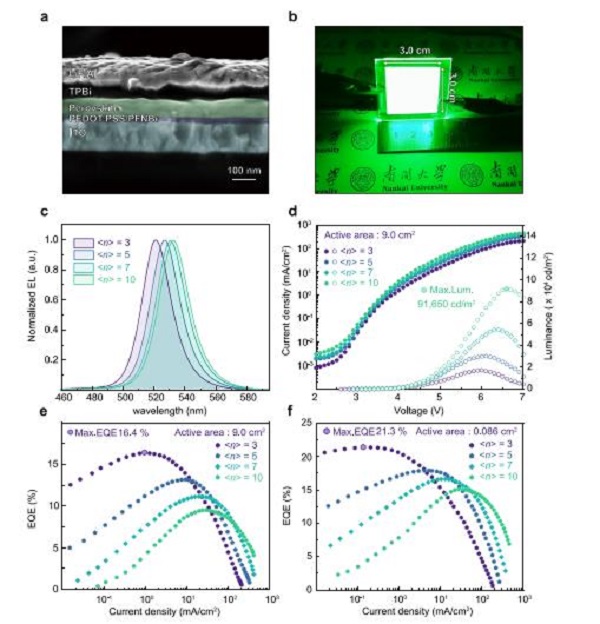 研究人员研究了广泛应用的活性膜制备方法的失效机理;并将其归因于严重的相偏析。因此,他们引入L-正缬氨酸来构造具有低生成焓的COO -配位中间相。新的中间相改变了结晶路径,从而抑制了相偏析。因此,他们获得了性能优良的高质量大面积准二维钙钛矿薄膜。在此基础上,他们进一步合理调整了薄膜的复合动力学。他们报道了一系列活性面积为9.0 cm2的高效绿色准二维PeLED。最高效的大面积PeLED的峰值EQE为16.4%。准二维PeLED的亮度高达9.1 × 104 cd m−2。上述成果以“High-performance large-area quasi-2D perovskite light-emitting diodes”为题发表于国际期刊Nat. Commun. 上,通讯作者为南开大学化学院先进能源材料化学教育部重点实验室的袁明鉴研究员。