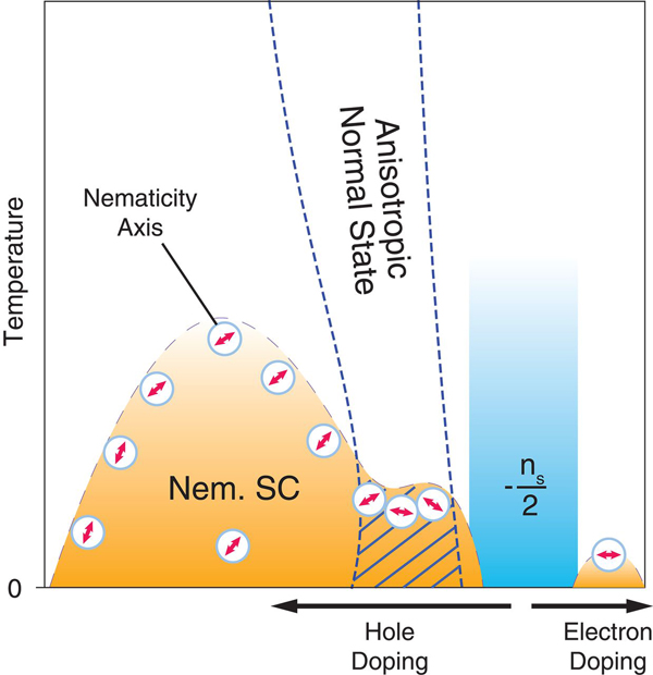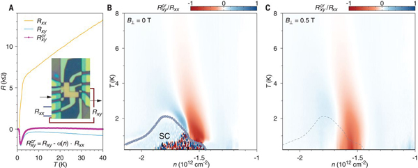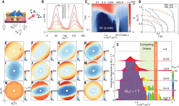 今日,在美国麻省理工学院Pablo Jarillo-Herrero教授和曹原(共同通讯作者)团队等人带领下,报道了在魔角扭曲双层石墨烯(TBG)中识别具有破碎旋转对称性的缠绕相。利用横向电阻测量,发现一个强各向异性相,位于超导圆顶的欠掺杂区域上方的“楔形区”内。当它与超导圆顶交叉时,观察到临界温度的降低。此外,超导态表现出对与方向相关的面内磁场的各向异性响应,揭示了整个超导圆顶的向列有序。这些结果表明,向列波动可能在魔角TBG的低温相发挥重要作用。相关成果以题为“Nematicity and competing orders in superconducting magic-angle graphene”发表在了Science。
