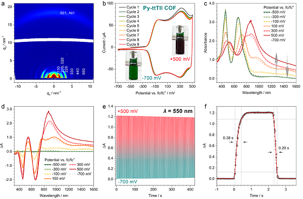 电致变色涂料在智能窗户和节能光学显示器上有着广阔的应用前景。然而,传统的无机电致变色材料如WO3,显色效率低,开关速度慢。德国慕尼黑大学Thomas Bein联合剑桥大学Florian Auras等人开发了基于全有机多孔共价有机框架(COFs)的高效、快速开关电致变色薄膜。低带隙COFs在中性状态下具有较强的vis – NIR吸收带,且在电化学氧化过程中发生明显的变化。完全可逆的吸收变化接近3OD,可以在低工作电压和单位面积低电荷下触发。该材料在880nm达到并保持>95%的电致变色效率,电致变色响应超过100次氧化/还原循环。此外,电致变色开关非常快,氧化反应时间低于0.4秒,还原反应时间约为0.2秒,比之前的COFs至少高出一个数量级,使这些材料成为迄今为止切换速度最快的框架材料。这种高显色效率和非常快的开关的结合为多孔有机电致变色材料的应用提供了有趣的机会。相关研究以“Fast-Switching Vis−IR Electrochromic Covalent Organic Frameworks”为题目,发表在JACS上。DOI: 10.1021/jacs.0c12392